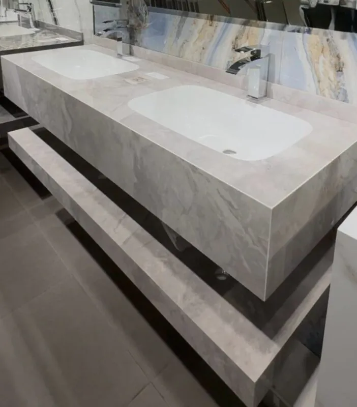 مغسلة صيني بورسلين رخامي موديل SYL1002B، مقاس 130 سم، بلون رمادي أنيق مع حوض ايمالك ومراية مضيئة. تصميم عصري وجودة عالية للحمامات الحديثة.
